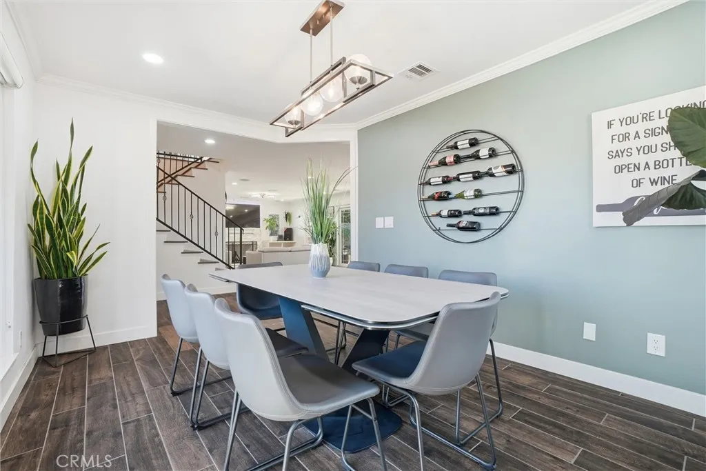 Tucked at the end of a quiet cul-de-sac, this spacious two-story home offers a thoughtful layout and quality updates throughout. The main level is filled with natural light and features porcelain tile flooring, recessed lighting, and an easy flow between the kitchen, dining, and living areas. The kitchen is designed for both function and style, featuring a six-burner range, stainless steel appliances, generous counter space, a breakfast bar, and a custom walk-in pantry. The living area is anchored by a stone-accented fireplace, creating a warm gathering space. A flexible room on the main floor works well as a home office, playroom, or additional living space. Oversized sliding doors open to a private backyard with a covered patio, built-in bar and grill area, open lawn, and mature fruit trees including orange and dragon fruit. Upstairs, the primary suite offers an updated bath with dual sinks, walk-in shower, and soaking tub. Three additional bedrooms share a refreshed hall bath. A custom media and family room completes the upper level with surround sound, a wall mural, and access to a private balcony. Located near local schools, shopping, dining, and everyday conveniences, with easy access to major freeways for commuting throughout Orange County.