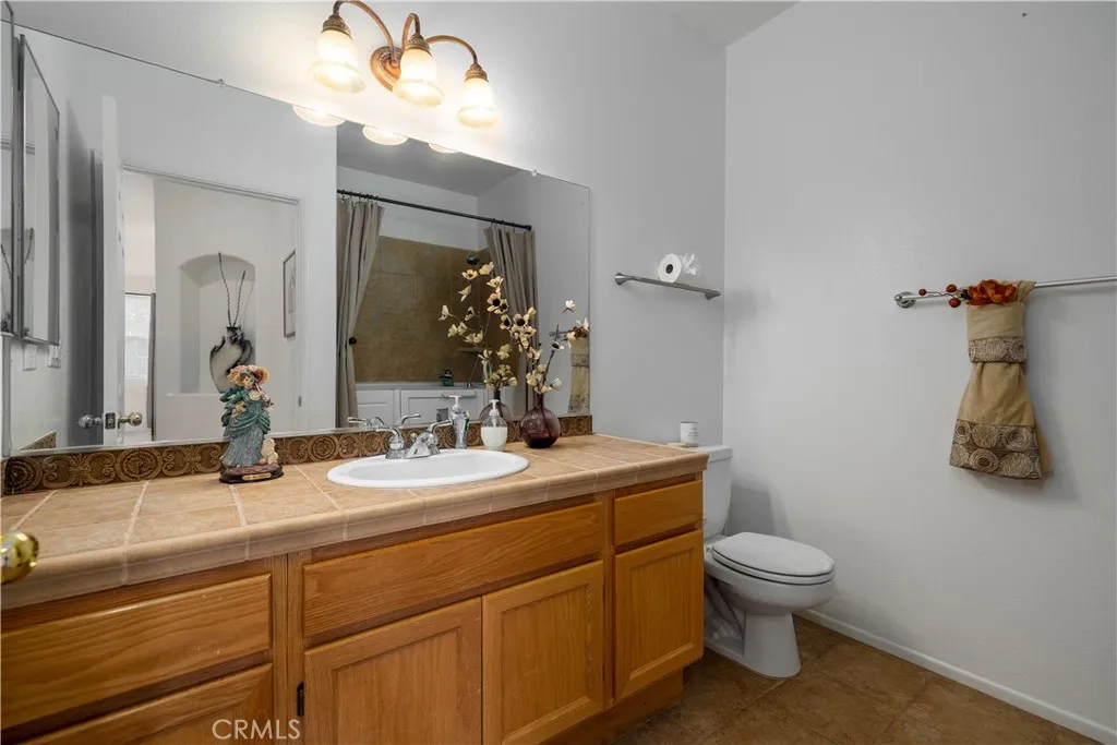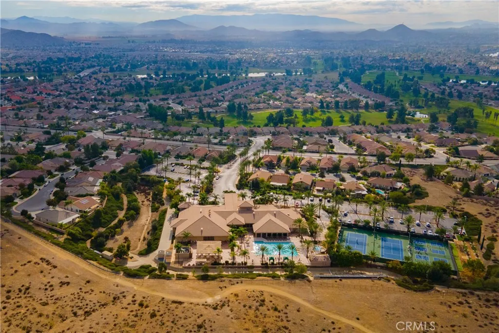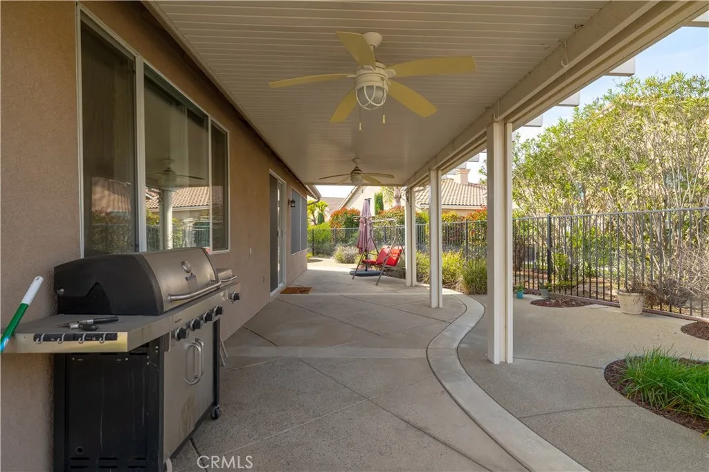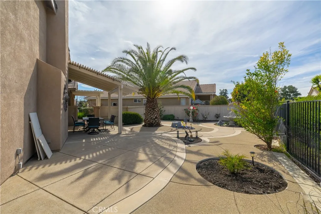 Welcome to 29427 Bentcreek Ct, located in the highly desirable 55+ guard-gated Oasis community in Menifee. This beautifully maintained Curaao model offers 2,085 sq ft of thoughtfully designed single-story living with 2 bedrooms, 2.5 bathrooms, and a versatile den/office with double doors. The spacious layout features formal living and dining areas, along with a comfortable family room with fireplace that opens to the kitchen, creating an ideal setting for both everyday living and entertaining. The upgraded kitchen includes a large center island with sink, ample cabinetry, under-cabinet lighting, and generous counter space. A private hallway leads to the guest suite with its own full en-suite bathroom, providing separation and privacy for visitors. The primary suite is generously sized and features dual sinks, a soaking tub, walk-in shower, and a spacious walk-in closet. A convenient indoor laundry room with sink and cabinetry adds everyday functionality. Situated on one of the larger lots in the community, the backyard showcases custom stamped concrete that wraps around the home, mature landscaping with fruit trees, and covered patio areas ideal for relaxing or entertaining outdoors. Living in The Oasis means enjoying resort-style amenities within a beautifully maintained 24-hour guard-gated setting. Residents have access to a 22,500 sq ft clubhouse featuring a banquet room, fitness center, billiards, library, and numerous social clubs and activities, along with a pool, spa, tennis and pickleball courts, and scenic walking paths. The community is adjacent to Menifee Lakes C