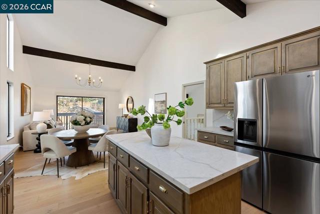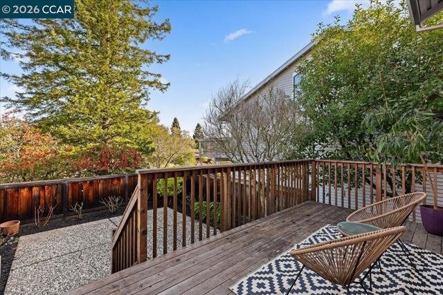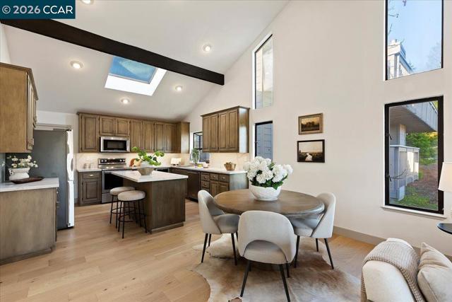 Welcome to effortless, resort-style living in Moraga Country Club. Tucked away on a quiet, private court with no front or rear neighbors, this detached Wimbledon model offers rare privacy and tranquil hillside views. Inside, the home features two bedrooms, two bathrooms, and a versatile bonus den/laundry room. Outdoor living shines with a private patio, expansive deck, landscaped yard, and generous storage. Recent updates include white oak engineered hardwood floors, fresh interior paint, quartz kitchen countertops, statement chandeliers, and newer stainless steel appliances. Soaring ceilings and skylights bathe the home in natural light, creating a bright, airy ambiance perfect for relaxing or entertaining. Enjoy full access to Moraga Country Club’s coveted amenities—championship golf, a newly rebuilt clubhouse, fitness center, tennis and pickleball courts, pools, bocce, and more—all just minutes from top-rated schools, BART, scenic trails, and local parks. This is Moraga living at its finest.