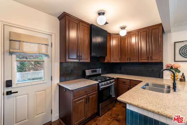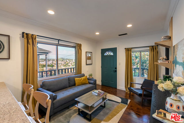 Lovely Hilltop Bungalow in City Terrace, Los Angeles... Perched perfectly on a quiet street, this charming and thoughtfully remodeled bungalow offers sweeping views of the surrounding hills and the San Gabriel Mountains beyond an ideal place to call home. Located in vibrant City Terrace, just minutes from Downtown Los Angeles, this 2-bedroom, 1-bath residence blends privacy, comfort, and modern updates in a truly special setting. Enter through a private gate and ascend a short flight of stairs to a covered front deck that wraps gracefully toward the backyard, creating seamless indoor-outdoor flow. Inside, the open living area features custom built-in shelving and opens to a chef's kitchen outfitted with stainless steel appliances, granite countertops, rich wood cabinetry, and a generous counter bar perfect for entertaining. Down the hall, two bedrooms enjoy east-facing windows that capture morning light and picturesque views. The primary bedroom includes a spacious walk-in closet and convenient stackable washer and dryer. The renovated hall bathroom features vibrant colorful custom tile, a heated towel rack, and ample counter space. The backyard patio is a true retreat ideal for unwinding at the end of the day, hosting friends and family, dining under the stars, or enjoying a weekend BBQ. Additional features include central heat and air, smart home upgrades, in-unit laundry, and energy-efficient dual-pane windows. Conveniently located near beloved Eastside, a 10-minute drive to Highland Park amenities. Or explore locally such favorites as El Mercadito Market, X'tiosu Kitchen, Otomisan, El Tepeyac Cafe, Guisados, and La Monarca Bakery, with easy access to Cal State LA, USC Keck School of Medicine, and Downtown LA's renowned museums and dining.