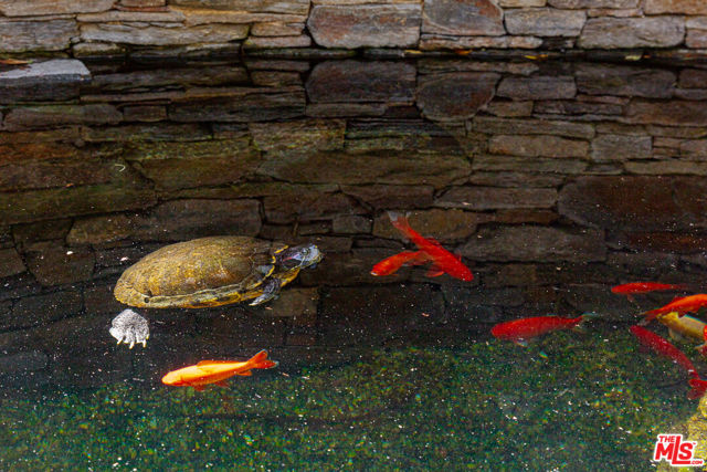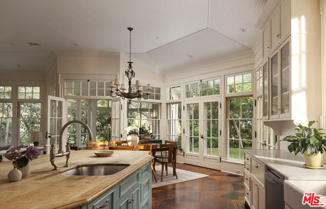 In beautiful lower Mandeville Canyon rests a magical gated private compound, hidden from the street and nestled up a long, tree-lined tranquil driveway. Situated on nearly one acre of lush grounds decorated by blossoming hydrangeas, cascading wisteria, and swaying trees, this rare find was designed by architect Lise Claiborne Matthews, AIA, ASID, and has never been on the market. Once the site of a historical botanical garden, the property spans two verdant parcels, fully encircled by beautiful mature trees for complete privacy. The enchanting facade opens to interiors that blend elegance and warmth, with soaring ceilings, curved glass windows, French doors at nearly every turn, and exquisite custom millwork throughout. Inside, the open-concept design encourages effortless entertaining. Guests are immediately met with a feeling of grand scale and sophistication, as they enter through the foyer and are met with the elegant dining room and formal living room with high architecturally custom-designed ceilings, functional curved glass windows, and anchored by a marble fireplace. Gorgeous greenery and filtered light is to be admired from every window of this stunning home. The living area features a cozy step-down family room with a media center and fireplace, while the chef's kitchen is equipped with a butcher-block island, three sinks, Viking range, Sub-Zero refrigeration, dual Miele dishwashers, and a pantry. A sunlit informal dining area and tranquil sunroom offer a serene setting for coffee, reading, or admiring the surrounding gardens. For grand occasions, the formal living room and dining room provide elegant settings for hosting gatherings, celebrations, and memorable evenings. The balance of the main floor contains an elegant guest suite, a large study, and a sixth bedroom. The expansive primary suite includes a sitting room, custom niches, French doors to a private balcony, and a spa-like bath with marble dual-sink vanity, oversized steam rainwater shower, soaking tub, dual water closets, dressing are, and two walk-in closets. Secondary bedrooms are spacious and full of charm, offering tranquil views of greenery and light throughout. On the recreational level, one would find an entertainment and wellness space with kitchenette, billiards room, sauna, cinema, gym, wine cellar, and a soundproof playroom, along with a light-filled atrium. Outside, the resort-style amenities include a sparkling 50-foot saltwater pool, meditation garden, koi pond, grassy lawn, patios, and lounging decks. Ample space allows for future additions such as a play area or sport court. Completing the estate is a three-car garage, a large fully functional gym or potential ADU, a large motor court, and additional parking accommodating twelve-plus vehicles. Offered furnished or unfurnished, this rare retreat is just minutes from Brentwood, Santa Monica, Pacific Palisades, and all the conveniences of the Westside, yet feels worlds away.
