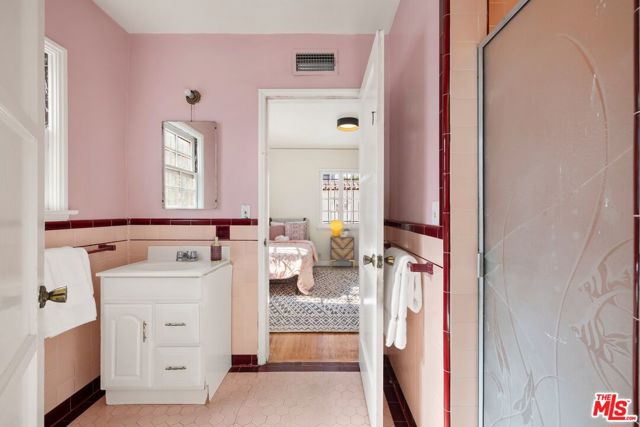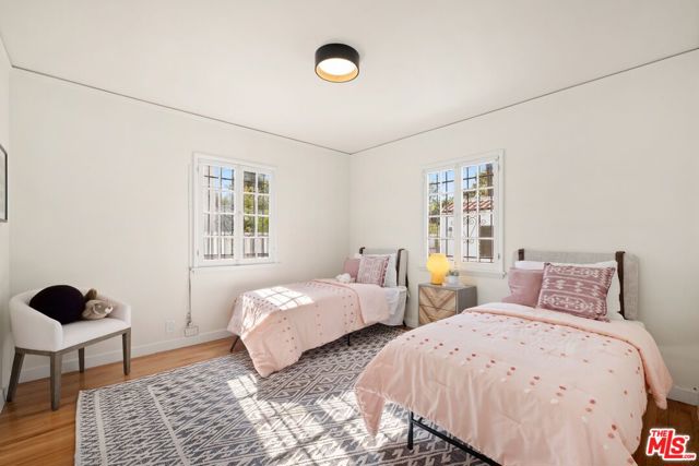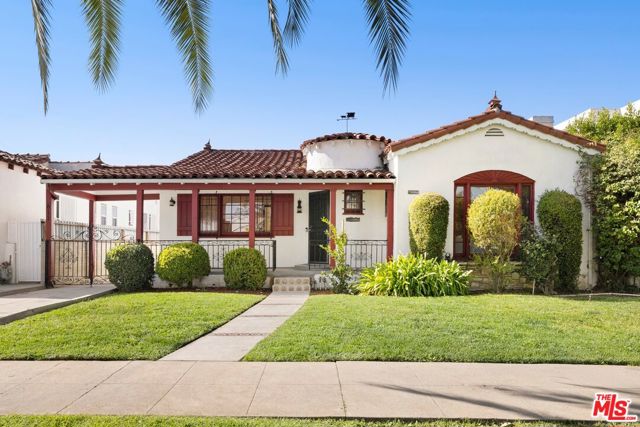Discover this meticulously preserved 1920s Spanish-style single-story home, boasting 5 bedrooms and 3.5 bathrooms, complemented by a modern ADU. Step onto the welcoming front porch, adorned with fresh Spanish tile and lush greenery, leading to a grand foyer with original parquet flooring and natural wood built-ins. The expansive living room features a wood-burning fireplace and a large picture window, while the formal dining room, with elegant wood wainscoting, overlooks the porch. The charming breakfast nook showcases a built-in China display cupboard, flowing into a spacious kitchen with original hardwood cabinetry, vintage hardware, and striking 1920s deco tile. Two bedrooms feature en-suite bathrooms, with the others sharing well-appointed hallway bath. (One of the back bedrooms is staged as family room) A versatile office/study and ample hallway storage add functionality. The separate laundry room, doubling as a pantry, opens to a private backyard with fruit trees, synthetic turf, and a luxurious new 2-bedroom, 1-bath ADU. Nestled in the vibrant, tree-lined neighborhood of Beverly Grove this home offers proximity to cultural landmarks, trendy dining, and excellent schools.