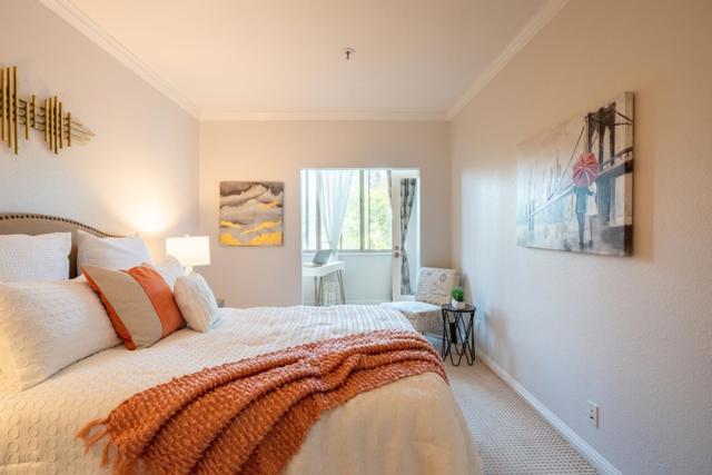 Beautiful starter home located in a prime central location in Santa Clara. High ceilings, large windows with an abundance of natural light. Airy and open living room w/fireplace. Nice kitchen with granite countertops and stainless steel appliances. Spacious master suite offers oversized dual sink vanities, walk-in closets, and bonus area which could function as a great home office. In-unit washer/dryer, Central heating and A/C, plenty of guest parking. Secured complex with swimming pool, sauna, jacuzzi, weight room & outdoor BBQ area. Walking distance to Agnew Park, Levi's Stadium, Great America & Rivermark Plaza. Minutes away from 101 & 237, tech companies and schools.
