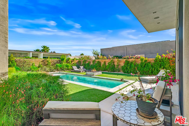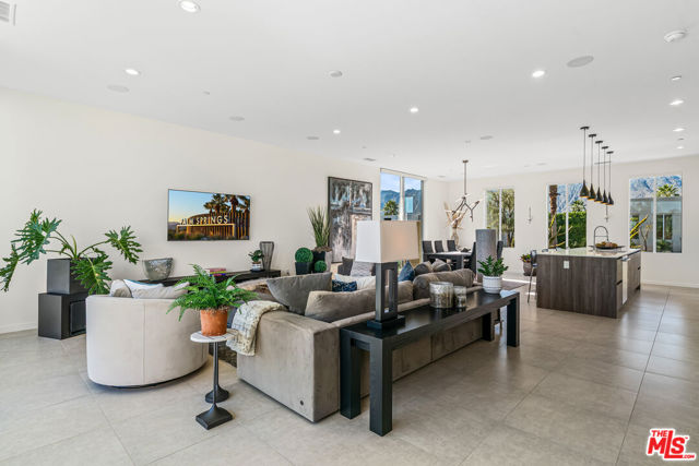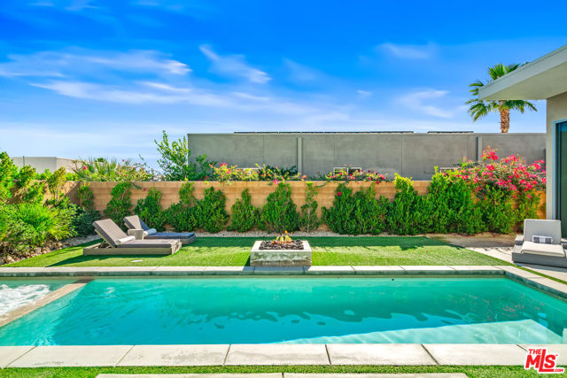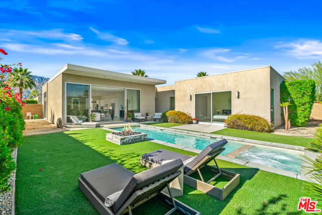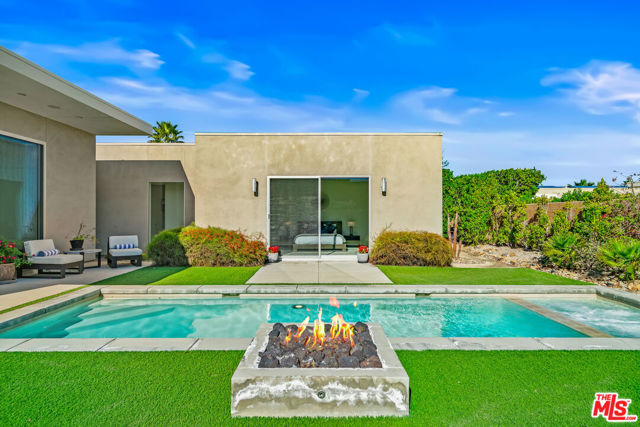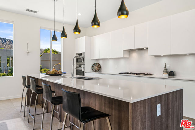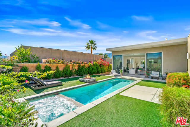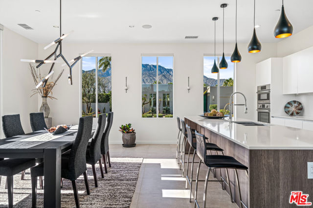 Experience elevated desert living at Escena in this luxury residence designed by renowned architect Anthony Poon and built by Alta Verde. The sought-after Garden floor plan is designed for seamless indoor/outdoor living, featuring a wall of floor-to-ceiling Fleetwood sliding doors that open from the living room to a private entertainer's backyard with pool, spa, fire-pit and breathtaking San Jacinto Mountain views. The expansive great room offers 10-foot ceilings, elegant tile flooring, and abundant natural light. The gourmet kitchen is a showpiece with an oversized island, designer pendant lighting, custom countertops and backsplash, Bosch appliances, and sleek Italian cabinetry perfect for both entertaining and everyday living. The sun-filled primary suite is a peaceful retreat with a spacious walk-in closet and spa-like bathroom featuring a floating dual-sink vanity, soaking tub, and walk-in shower. Two well-appointed guest bedrooms share a generous Jack-and-Jill bathroom, ideal for guests or family. Additional highlights include owned solar, dual-zone HVAC, home security system, and a two-car garage equipped with an upgraded electric vehicle charger. Escena is a beautifully landscaped guard-gated community offering access to a clubhouse, championship golf course, dog parks, and low HOA dues. Select furnishings available. (See photos, floor-plan & 3D Matterport)