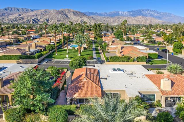 Appreciate this exceptional location, thoughtful design, and the value of high-quality upgrades! Upon entering you'll notice the cohesive design and attention to detail throughout--no mixed finishes. The kitchen is a showstopper with mountain views, a large farmhouse sink, sleek modern cabinetry, stunning white quartz countertops with mosaic backsplash, and high-end stainless GE appliances, including a 5-burner gas range with suspended hood, plus a built-in wine fridge. An attached 2-car garage with lots of storage is conveniently accessed from the kitchen. Throughout the home, all exterior windows & sliders, and interior doors, frames & moldings have been replaced. A new A/C was installed in June 2024. Additional features include wood-plank tile flooring throughout, smooth-finish ceilings, recessed LED lighting with Lutron variable controls, and remote-controlled, variable-height cellular blinds in the living areas and primary bedroom. The open living and dining area is anchored by a striking architectural accent wall and a modern white stone fireplace with rustic wood beam mantle and integrated TV. The primary suite is a true retreat with wall-mounted TV, architectural accent wall, large walk-in closet with custom built-ins, and direct access to the beautiful, private patio. The elegant ensuite bath features double sinks, high-tech mirrors, and an expanded layout showcasing a freestanding soaking tub AND waterfall shower. Two guest bedrooms are thoughtfully separated by a covered atrium with two remote-controlled skylights equipped with rain sensors for automatic closing, convenient built-ins & more. The beautifully tiled guest bath is equally impressive. The spacious gated patio is a private oasis enclosed by tall, lush Ficus hedges and low-maintenance desert landscaping. Ideally located in a very private setting with mountain views, lush greenery, internal location away from busy streets, and no homes behind, this impressive property is directly across from a community pool and spa, guest parking, and community mailbox. The community offers walking paths, tennis, pickleball, 4 community pools/spas with a low HOA fee of $548/month.
