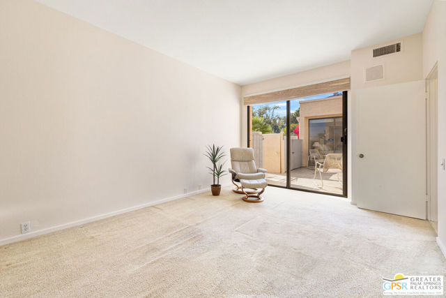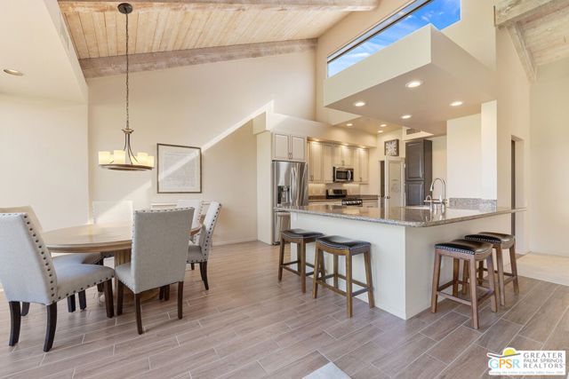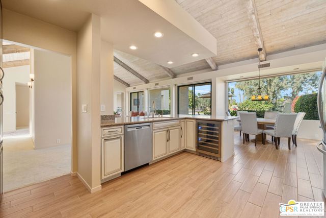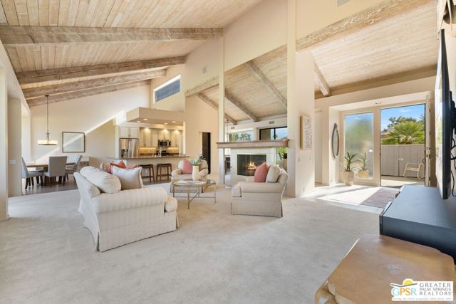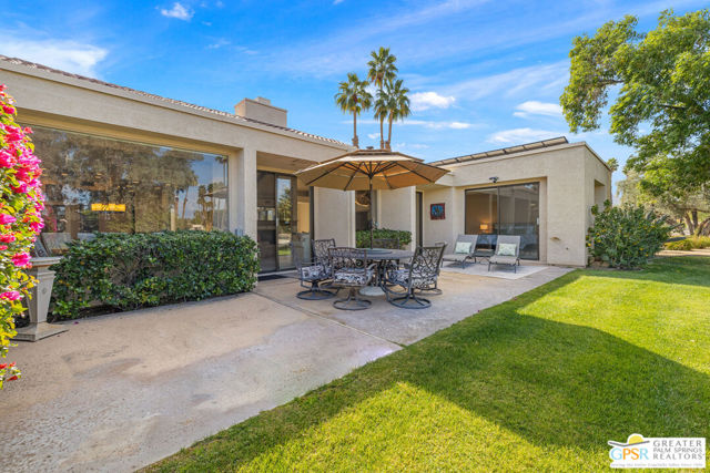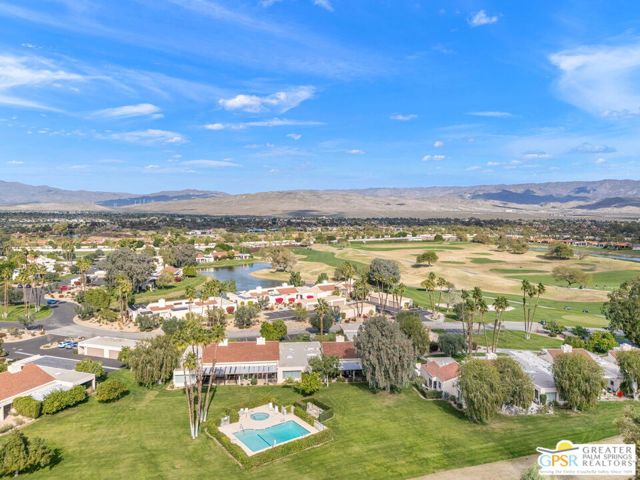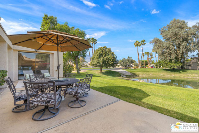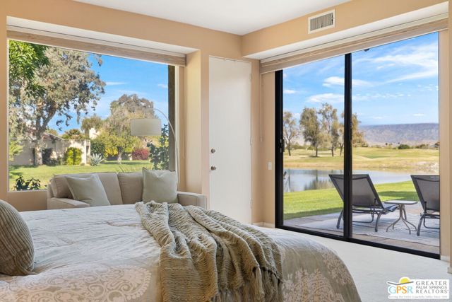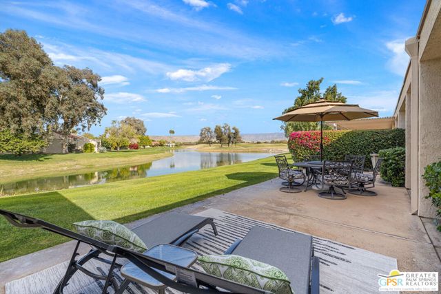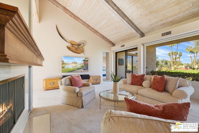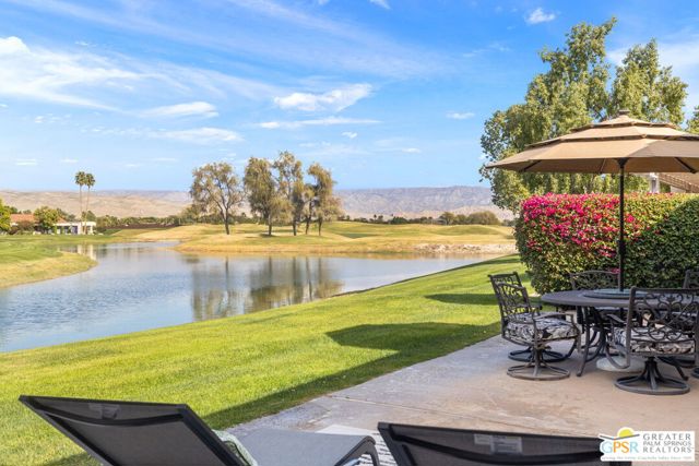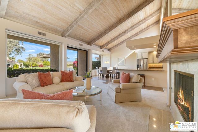 Location truly sets this one apart. Ideally positioned near the clubhouse at Mission Hills Country Club, this single-level, single-story 3 bedroom, 3 bathroom furnished condo captures panoramic lake, fairway, and mountain views across to the Pete Dye Course. Spanning approximately 2,400 square feet, the upgraded residence is thoughtfully designed to embrace its surroundings, with expansive windows and sliding glass doors creating seamless indoor-outdoor living. The main living area is both dramatic and inviting, highlighted by a vaulted wood-beam ceiling, gas fireplace, and open sightlines that frame the scenic backdrop. The open kitchen has been updated and features a clerestory window, counter seating, and an adjacent dining area filled with natural light ideal for everyday living and entertaining. The bedroom layout offers excellent separation and privacy. The Primary Ensuite includes a retreat area, direct patio access, sweeping views, and a private bath with dual vanities, expansive closet space, and both tub and shower. Junior Ensuite Two opens to the courtyard and enjoys its own full bath, while Bedroom Three is privately positioned on the opposite side of the condo with an adjacent bath and courtyard access - perfect for guests or flexible use. Additional highlights include rooftop solar, a two-car garage with attached golf cart storage, and close proximity to the community pool and spa as well as the member clubhouse.