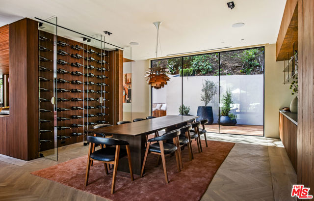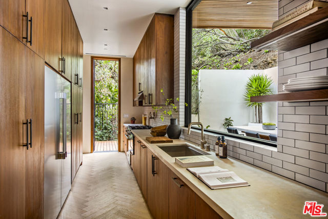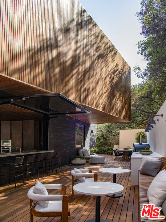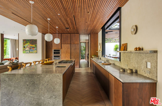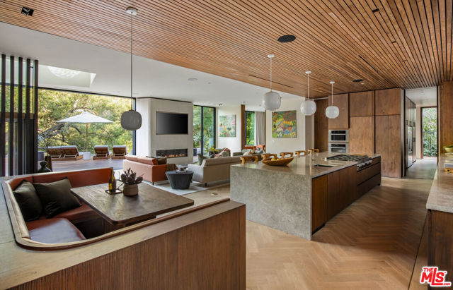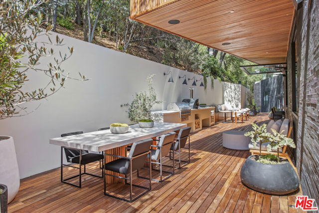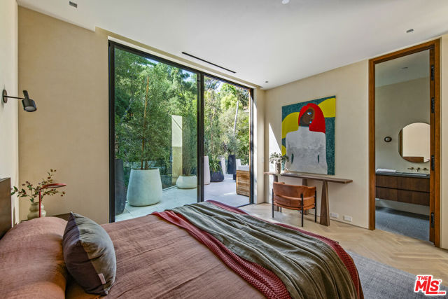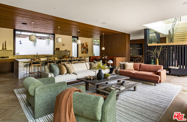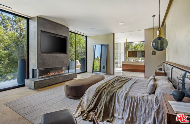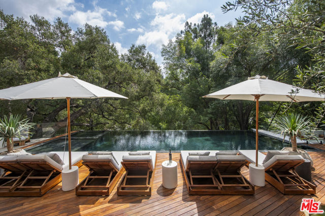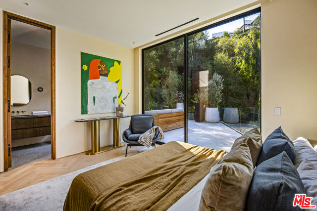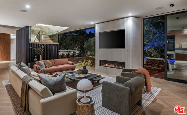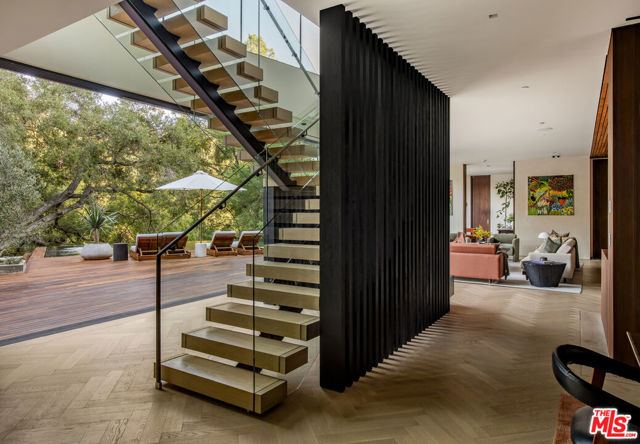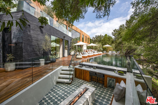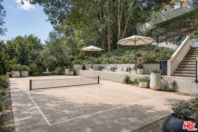 The Hutton House is a rare architectural sanctuary, where transitional Scandinavian modern design meets privacy, nature, and understated luxury in one of Beverly Hills' most coveted settings.Set behind gates on nearly an acre and enveloped by mature oak trees with tranquil canyon views, this newly constructed six-bedroom, nine-and-a-half-bath estate, interior designed by Abramson Architects, offers a level of serenity and seclusion that is increasingly difficult to find. The exterior blends warm teak wood siding with sculptural black basalt stone, softened by mature hedging that creates a true sense of arrival.Inside, soaring ceilings and expansive Fleetwood pocket doors dissolve the boundary between indoors and out, filling the main living spaces with natural light and an effortless sense of flow. Organic, bespoke finishes and carefully curated materials lend the home a calm, resort-like ambiancerefined, warm, and timeless.The heart of the home is a chef's kitchen designed for both daily living and entertaining, anchored by a striking 15-foot custom stone island, top-tier Miele appliances, an intimate breakfast nook, and an automated pop-up window that opens seamlessly to outdoor dining and lounge areas.Upstairs, the primary suite is a private retreat overlooking the canyon, featuring dual custom closets, a sculptural plaster floating fireplace, a secluded deck, and a spa-inspired bath with steam rain shower and custom birchwood sauna. A state-of-the-art gym is also located on this level, allowing for wellness and relaxation within the home's most private wing. An expansive 50+ foot skylight floods the upper level with natural light, while four additional bedroom suites extend to private outdoor decks, reinforcing the home's connection to its natural surroundings.A floating staircase highlighted by a one-of-a-kind chandelier art installation acts as both a functional element and sculptural centerpiece. Below, the lower interior level is dedicated to entertainment and leisure, featuring a tiered private theatre, temperature-controlled wine storage, and thoughtfully designed gathering spaces ideal for evenings in or hosting intimate events.Outdoors, the estate unfolds in layered fashion. The upper grounds are anchored by a zero-edge infinity pool and spa with swim-up bar, multiple fire pit lounges, and fully equipped outdoor kitchensdesigned for both large-scale entertaining and quiet moments of retreat. Below, a private outdoor lower level reveals a full pickleball court with stadium-style seating, set into lush landscaping, a grassy knoll, and handcrafted water features, creating a resort-style experience rarely found in a private residence.Additional amenities include a secondary chef's kitchen, private office with custom cabinetry, Savant-powered smart home technology, two well-appointed laundry rooms, a showcase three-car garage, and additional parking for up to ten vehicles. The residence is also offered with custom-designed indoor and outdoor furnishings created specifically to complement the home's Scandinavian aesthetic.The Hutton House is not simply a home, it is a composed and intentional environment where architecture, nature, and privacy coexist in perfect balance. A truly rare offering just minutes from the heart of Beverly Hills, designed for those who value quiet luxury, thoughtful design, and a life well lived.