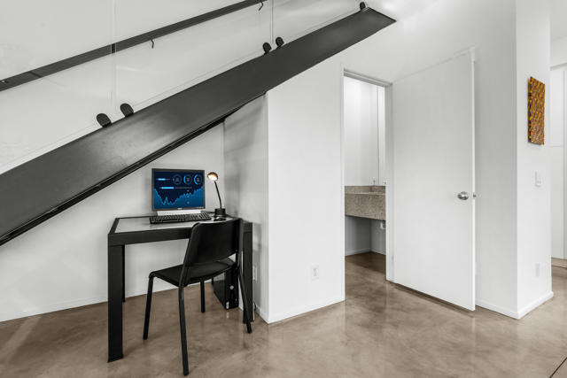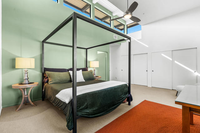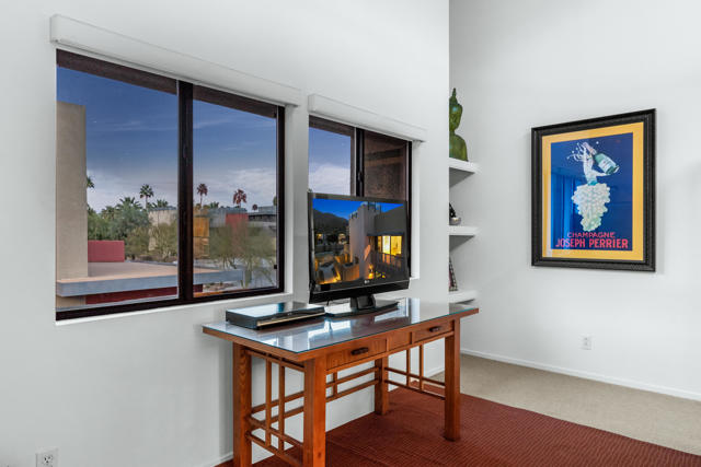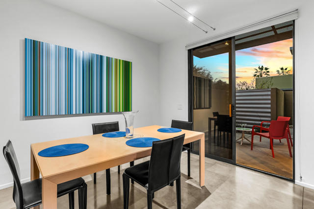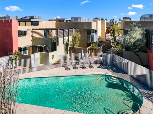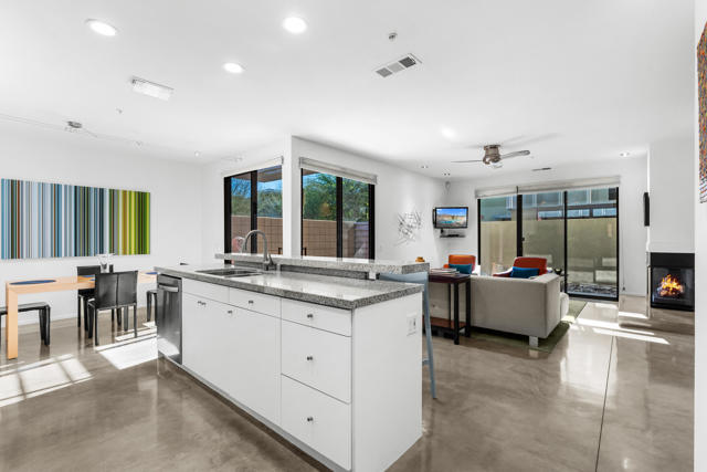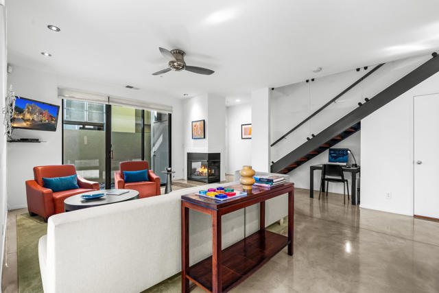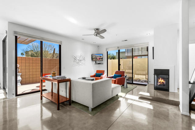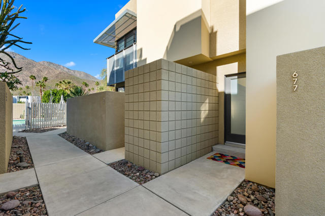 Introducing 677 East Arenas, a rarely available corner unit located in the sought-after 48 @ Arenas community. This contemporary condominium has refined modern finishes, and a premier downtown address. Owners benefit from Fee Simple land (MEANING YOU OWN THE LAND!), along with access to four well-maintained community pools and spas, all within minutes to Palm Springs' renowned dining, shopping, and entertainment destinations. The residence features an open floor plan with polished concrete flooring that extends into a kitchen equipped with sleek cabinetry, granite countertops, and stainless-steel appliances. The thoughtfully designed living area includes high ceilings, a gas fireplace, and direct access to outdoor patios, enhancing the indoor-outdoor living experience. The main level also offers a powder room, in-unit laundry, and direct access to two spacious, covered parking spaces. A floating wood staircase leads to the upper floor, where there are dual primary bedroom suites. One of the bedroom suites is appointed with tall ceilings and clerestory windows for ample natural light. The second bedroom suite, which is also en suite, is generously sized and bright. Both bedroom suites are complemented with modern closet organizers. The property's low HOA fee encompasses earthquake insurance, water, trash service, and exterior and roof maintenance. This condo delivers modern design, an exceptional location, and resort-style amenities in central Palm Springs. Please contact us today for a private showing!