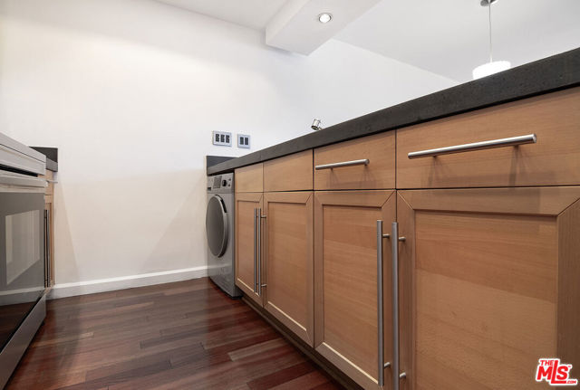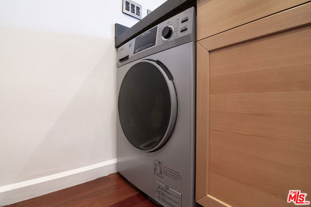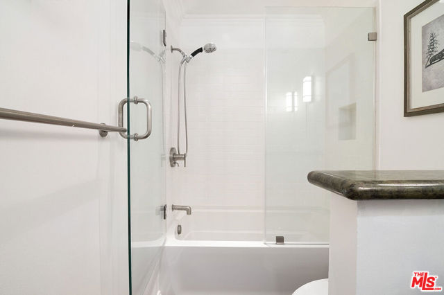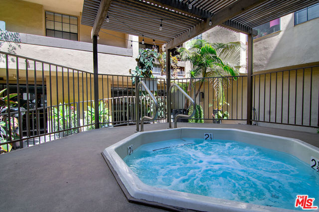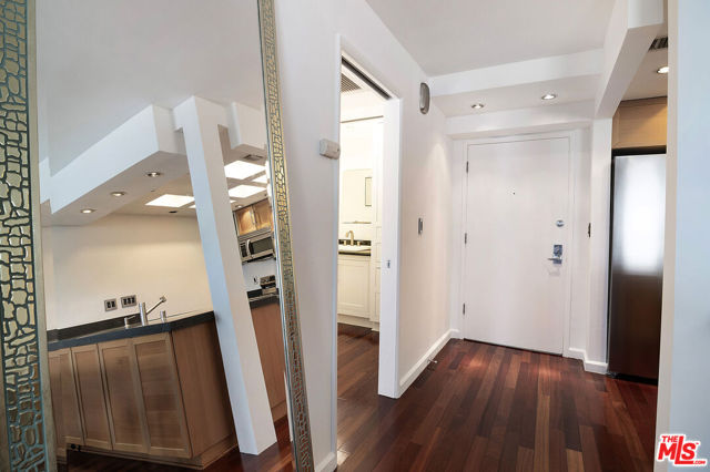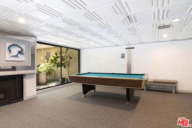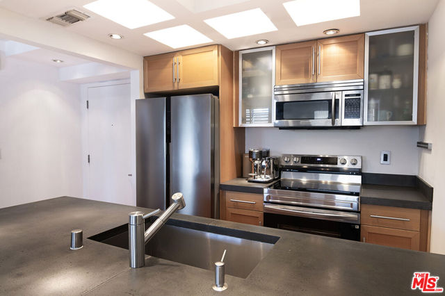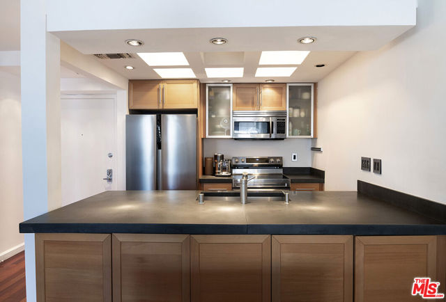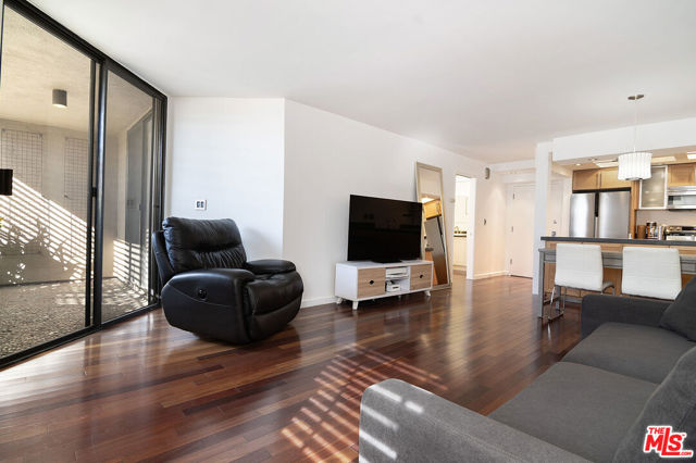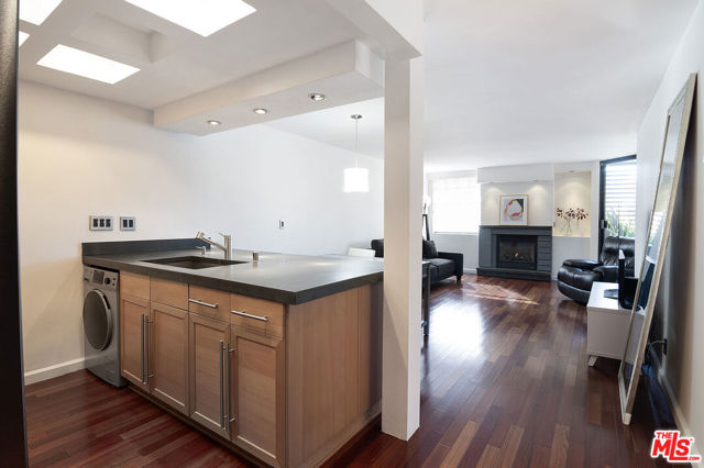 Top-floor south-facing 1-bedroom, 1-bathroom condo on tree-lined Kings Road in the heart of West Hollywood! The kitchen features stainless steel appliances, concrete countertops, recessed lighting, washer/dryer combo and generous cabinet space. Enjoy an open-concept dining and living area with a cozy gas fireplace and sliding glass doors that lead to a private patio. The spacious primary bedroom boasts a walk-in closet and direct access to the patio. The updated bathroom includes granite countertops and a tub/shower combo. Additional highlights include hardwood floors throughout and central AC. Community amenities include secure garage parking, a fitness center, two spas, laundry facilities on each floor, and a rooftop sun deck with BBQ area and stunning mountain and treetop views. Just steps from West Hollywood's top shops, restaurants, and nightlife!