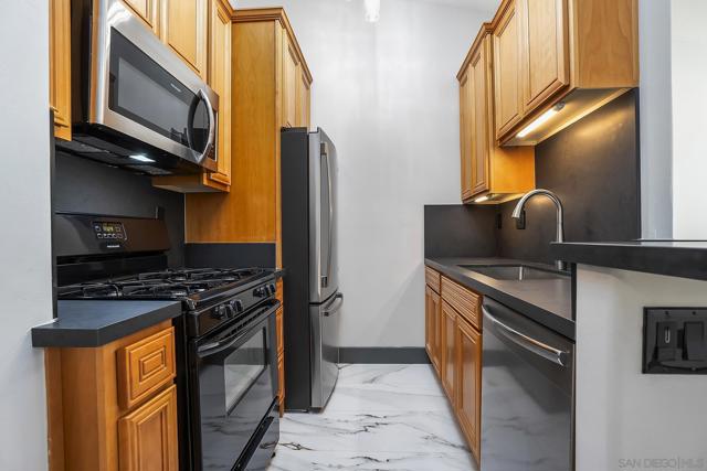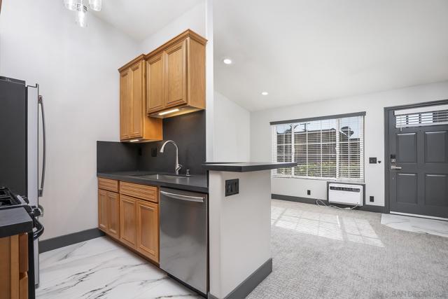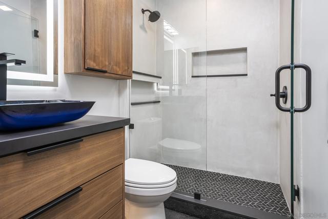 LOW HOA FEE of $240/mo INCLUDES WATER! Top Floor ~ Freshly Renovated 1 Bed/1 Bath! Brand New Contemporary Finishes with Vaulted Ceilings, Skylight, LED Fireplace, In-Unit Laundry & Parking Space! Gorgeous Kitchen with Black Quartz Counters & Custom Lighting, Hotel Inspired Bath with New Venetian Plaster Shower + Black Lava Floors + Floating Vanity with Blue Glass Sink! Bedroom has Custom Closet Organizers! Fresh Paint & New Flooring throughout! Charming Complex with Beautiful Courtyard featuring a Pergola with Patio & BBQ! Ideal Location where Hillcrest meets North Park- Walk to All!