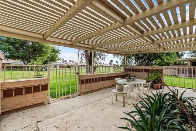 Delightful end unit overlooking tee box for 2nd hole of the Royal Course @ IPCC. Safe from golf balls. This lovely condo has recently replaced flooring with attractive vinyl throughout. Inviting living room has slider out to east patio which has recently replaced breezeway cover. Kitchen also opens to east patio. Several appliances have been upgraded. Primary bedroom has vaulted ceiling and spacious walk-in closet. Separate vanity and tub/shower, etc. There is a slider to private west patio. Guest bedroom is spacious and has walk-in closet. There is a slider out to private west patio. There is access to carport & garage from west patio. Single garage has space for a golf cart or bike?