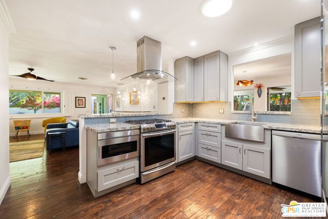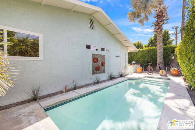 Beautifully renovated and completely dialed in, this 3-bedroom 2-bathroom residence with an open floor plan shows like a model in sought-after Movie Colony East. Walled and private with mature landscaping including a lemon tree, this desert escape blends designer finishes, thoughtful upgrades, and effortless indoor-outdoor living. Three distinct outdoor areas set the tone, including the enclosed east-facing front yard with gated entry and classic tiled porch, a south-facing side yard with covered patio, custom-built bar, outdoor kitchen with stainless drawers, Alfresco grill, Kamado smoker and fire pit, and an ultra-private west-facing backyard featuring a swim spa style lap pool and stunning Mt. San Jacinto views. Inside, wood flooring runs throughout the light-filled living areas where a gas fireplace framed by custom built-ins anchors the living room. The showcase kitchen offers counter seating, stylish finishes, soft-close cabinetry and drawers, and excellent flow into the adjacent dining area where a generous buffet and two sets of French doors open beautifully to the covered patio and mountain views. The primary suite is a true retreat with clerestory windows, striking tile work, a deep soaking bubble tub, and separate walk-in shower. Guest bedrooms Two and Three are positioned near a beautifully appointed hall bath with multi-jetted shower. Additional upgrades include a new foam and elastomeric roof completed in 2026, tankless water heater, and an air-conditioned 2 car garage with epoxy flooring, California Closets storage and workshop space. No monthly HOA and no land lease. Just moments from the best of downtown Palm Springs.
