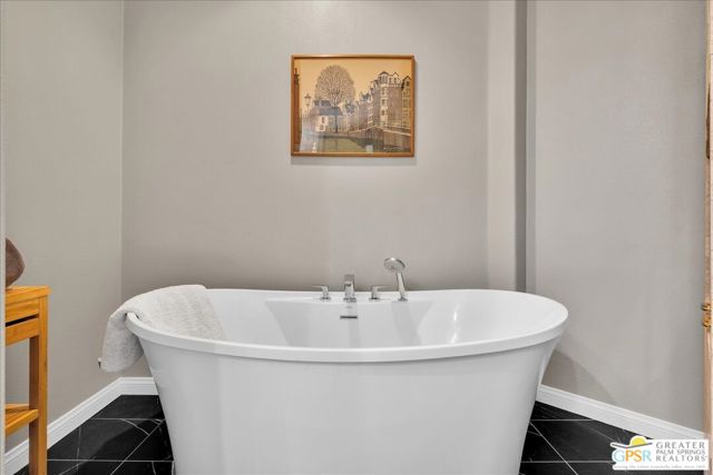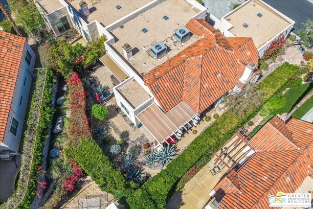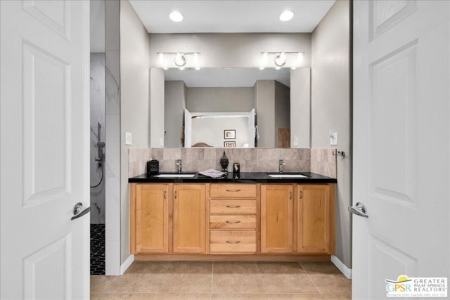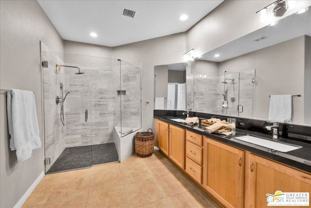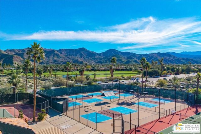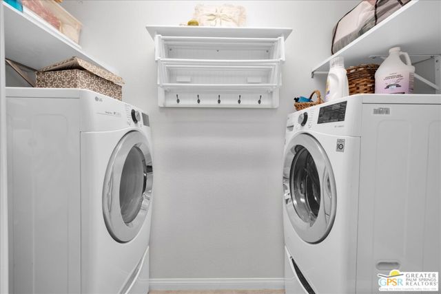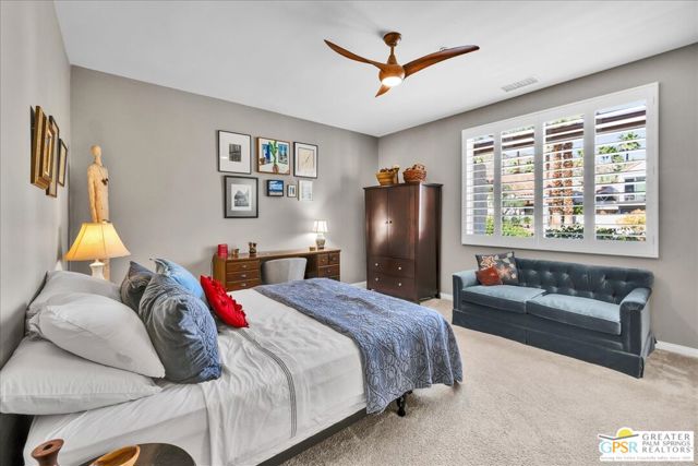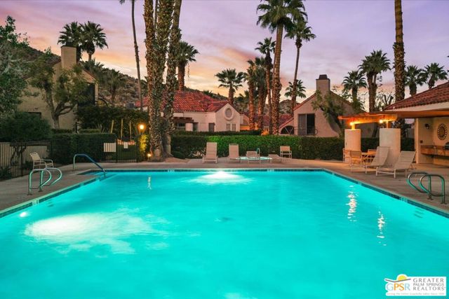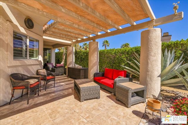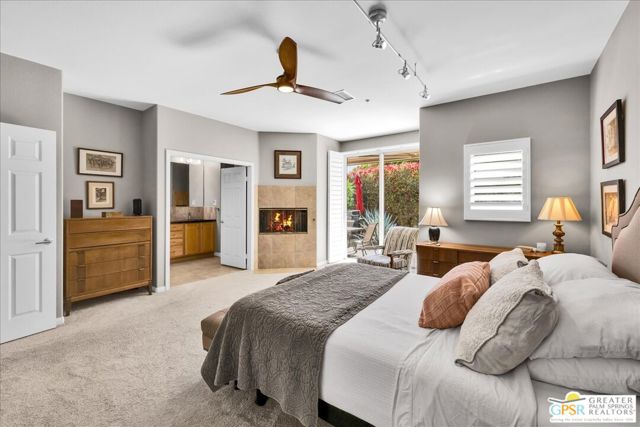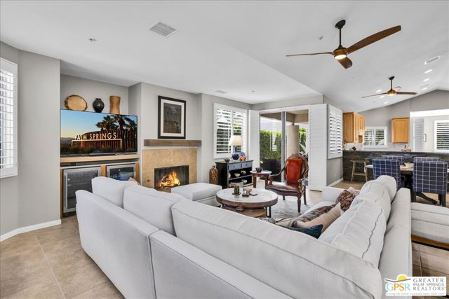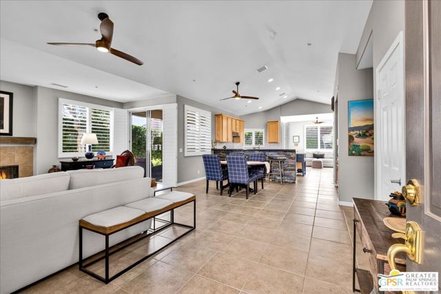 Rarely available Plan 1 Manzanita floorplan featuring two spacious ensuite bedrooms and two baths, ideally positioned within the sought-after gated community of Canyon Heights in desirable South Palm Springs. With a private yard, beautiful mountain views, and numerous thoughtful upgrades, this home offers a wonderful blend of comfort, style, and desert lifestyle. Inside, the home features 16-inch tile flooring, wood shutters, quality ceiling fans, and a fresh neutral color palette with crisp white trim throughout. The open-concept layout is enhanced by vaulted ceilings that extend from the entry through the great room and kitchen, creating a bright and airy atmosphere. The living room centers around a beautiful gas fireplace with tile surround and wood mantle, complemented by dual wine refrigerators, making the space both inviting and ideal for entertaining. The adjacent dining area also enjoys the soaring ceilings and includes built-in buffet cabinetry with generous counter space and storage, offering both function and style. The kitchen has been recently updated and thoughtfully designed with quartz countertops featuring dual waterfall edges, full-height backsplash, a Blanco single-vessel sink, and newer stainless steel appliances. A brand-new island with built-in refrigerated drawers adds both convenience and modern appeal. Just beyond the kitchen, a charming breakfast room is filled with natural light thanks to dual sliding doors and a large window bringing in sunlight from three sides. Both sliding doors provide seamless access to the private backyard, where ample covered patio space wraps around the home, creating multiple areas for relaxing and entertaining amid mature desert landscaping and mountain views. The primary suite offers direct access to the backyard and features a large walk-in closet and an elegant double-sided gas fireplace shared with the spa-inspired bathroom. Enter the ensuite through French doors to find a dual vanity with natural granite countertops and undermount sinks, Hansgrohe fixtures, natural stone backsplash, a custom tile rain shower with bench, and a soaking tub positioned beside the fireplace for a truly relaxing retreat. A power retractable awning just outside the suite enhances the outdoor living experience. The secondary ensuite bedroom is generously sized and enjoys mountain views along with a large mirrored closet. The attached bathroom features a custom zero-threshold glass-enclosed rain shower with bench, a spacious vanity with granite countertops, dual undermount sinks, and Hansgrohe fixtures. Additional highlights include invisible sliding screen doors, a large laundry closet with LG washer and dryer including small-load washing drawer, and a semi-attached two-car garage with epoxy floors and extensive built-in storage. The home also includes an owned water conditioning system, hot water circulation system, and insulated garage door. A rare bonus for the community, this residence also features its own full driveway, providing convenient additional parking for residents and guests. Canyon Heights offers an exceptional lifestyle with four pools, four spas, two tennis courts, six recently refinished pickleball courts, a clubhouse, fitness room, and a community fruit orchard. Two public championship golf courses are located just outside the gates, and downtown Palm Springs dining, shopping, and entertainment are only minutes away. A rare opportunity to own a beautifully upgraded home in one of South Palm Springs' most desirable communities.