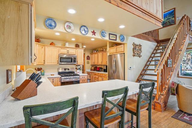 Charming mountain retreat with multiple outdoor living spaces, offering the perfect blend of comfort and character. This 2 bedroom, 1.75 bath home features **1,534 sq ft of living space** on a 0.21 acre lot. The main level offers a bedroom and bathroom, along with an updated modern kitchen and a cozy informal living area complete with a free-standing fireplace. **Dual pane windows and skylights flood the home with natural light**, creating a bright and inviting atmosphere throughout. A spacious laundry area and large walk-in butler's pantry provide excellent storage and functionality. The lower level also includes central heat and A/C for year-round comfort. Upstairs, the loft-style primary suite offers a private retreat with a full bathroom, walk-in closet, and its own mini-split system for heating and cooling. Step outside and enjoy three distinct entertainment areas, including a deck with hot tub and scenic views, a side patio gathering space, and an upper gazebo overlooking the property. Stone walking paths connect the outdoor areas, creating a peaceful mountain setting. Additional features include ample driveway parking and storage space beneath the home.