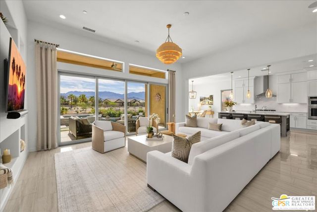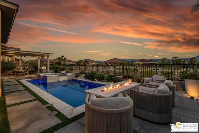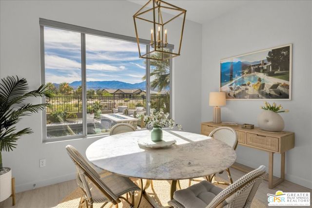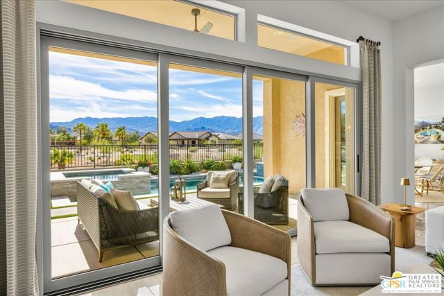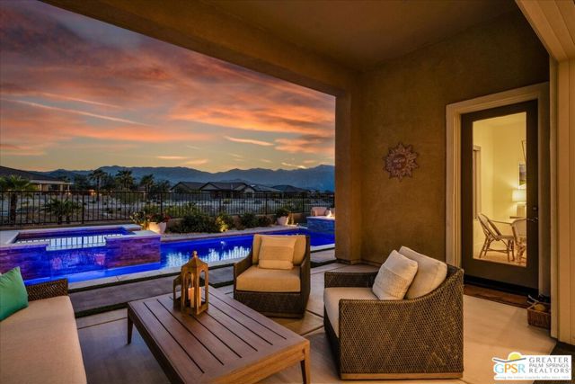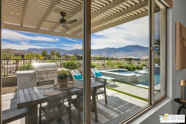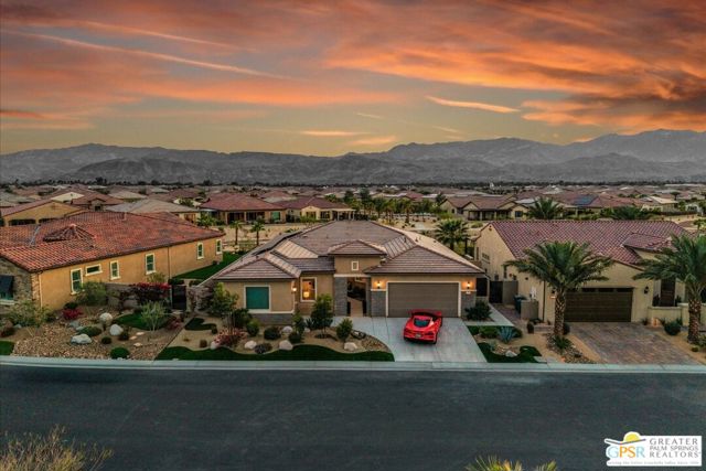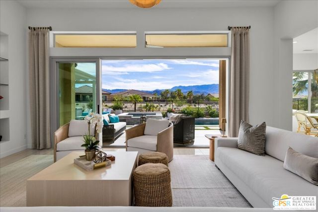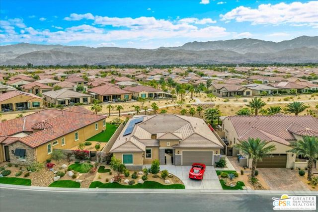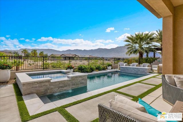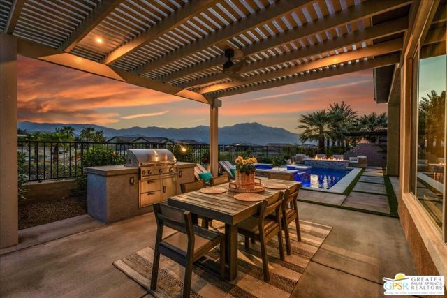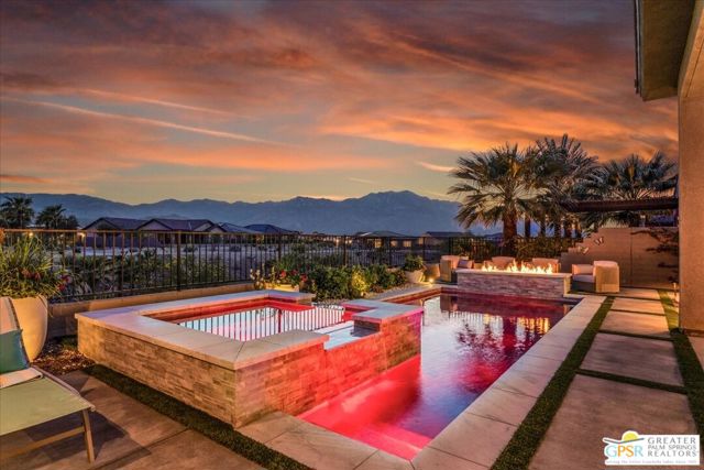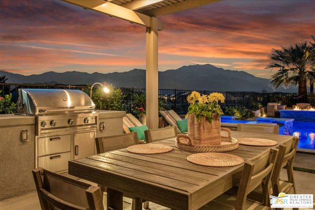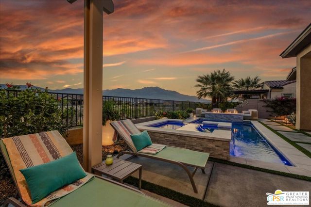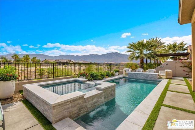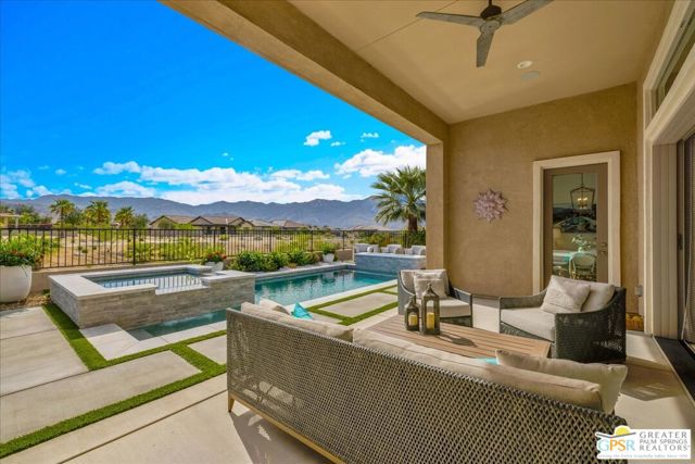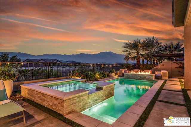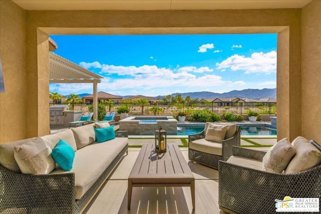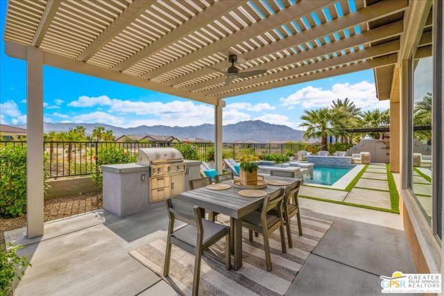 Stunning Journey Floorplan with Panoramic Mountain Views - Del Webb Rancho Mirage. Set on a premium view lot with breathtaking, unobstructed mountain views, this exceptional Phase 5, Plan 9 Journey with Tuscan facade offers a rare opportunity to experience elevated desert living within one of Del Webb Rancho Mirage's more intimate and thoughtfully designed enclaves - a community setting that feels distinctly more refined and manageable than larger-scale developments often found in other markets. Thoughtfully designed and beautifully appointed, this home features the desirable three-bedroom configuration with pass-through bath, ideal for hosting family and guests with both comfort and privacy. Inside, you'll find a sophisticated interior highlighted by porcelain tile flooring, remote-controlled window treatments, and a crisp neutral palette that enhances the home's light-filled ambiance. The heart of the home is the stunning chef's kitchen, showcasing white shaker cabinetry with 42-inch uppers, Jewel cabinets, and crown molding, paired with a premium KitchenAid Professional Series appliance suite. A standout feature is the upgraded DACOR side-by-side refrigerator/freezer with built-in ice and water dispenser, offering energy-efficient performance and SmartThings app connectivity for modern convenience. The expansive executive island, finished in a contrasting tone, offers additional storage, pendant lighting, and generous seating. The kitchen flows effortlessly into the breakfast area, living room, and formal dining space - all designed to capture the home's incredible setting. The breakfast room frames stunning mountain views, while the living room features 12-foot ceilings, a quad-panel sliding glass door system, built-in display niches with accent lighting, and integrated rear-channel speakers. The formal dining room is equally refined, complete with designer lighting, a statement accent wall, and a wet bar with quartz countertops and wine refrigeration. The primary suite is a serene retreat, offering warm wood-look porcelain flooring and sweeping views of the mountains and backyard oasis. The ensuite bath features dual vanities, upgraded fixtures, a glass-enclosed rain shower with custom stone flooring, linen storage, and a spacious walk-in closet. Step outside to a truly exceptional outdoor environment, where panoramic mountain views provide a breathtaking backdrop. The backyard was professionally designed and completed in 2024 by an award-winning contractor recognized by the City of Rancho Mirage, and features a stunning pool and spa finished in Natural Carrara porcelain tile (Grigio Gray), a custom fire pit, and a built-in BBQ beneath a pergola. The covered patio is further enhanced with an outdoor-rated Samsung TV, creating the perfect setting for relaxing evenings or entertaining under the desert sky. The guest wing is thoughtfully designed with two bedrooms, each with wood-look porcelain flooring connected by a pass-through bath, along with access to a convenient powder room, offering both comfort and flexibility for guests. Additional highlights include leased solar ($176/month), a two-car garage with epoxy floors, a separate golf cart garage, and numerous quality upgrades throughout. Located within the prestigious 55+ Del Webb Rancho Mirage community, residents enjoy access to a resort-style clubhouse, fitness center, pools and spa, tennis and pickleball courts, and a vibrant social calendar - with cable and internet included in the HOA. A refined, thoughtfully upgraded home offering luxury, privacy, and a truly exceptional desert lifestyle.