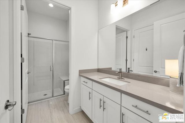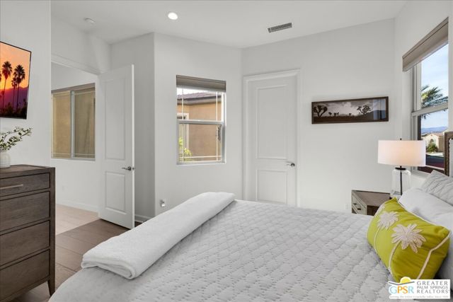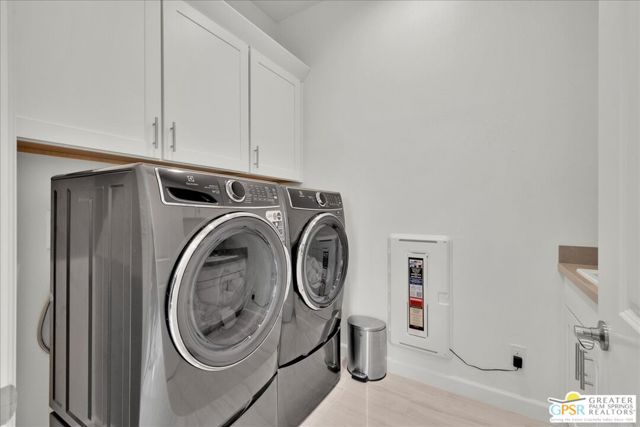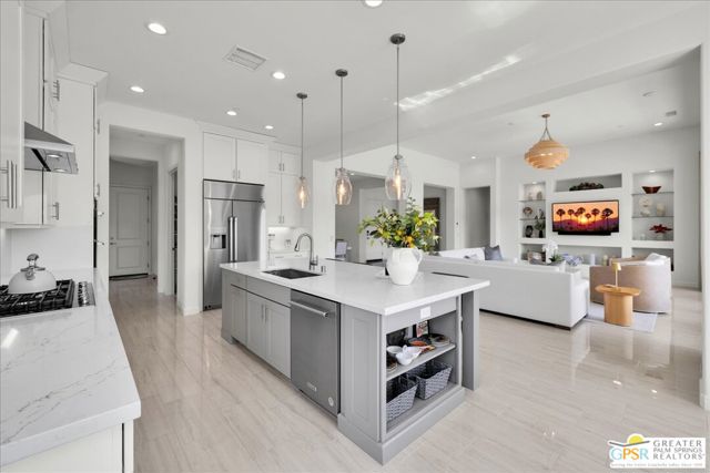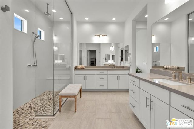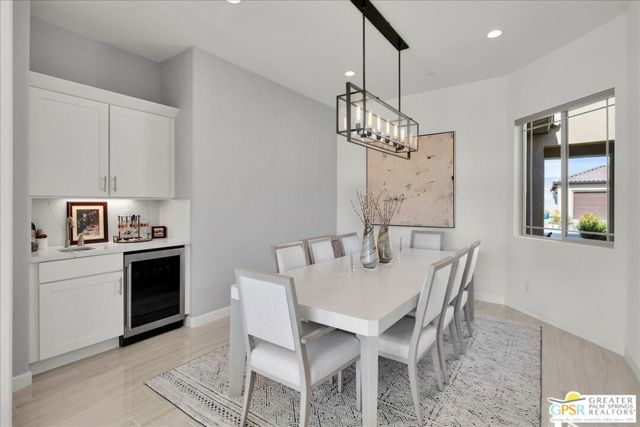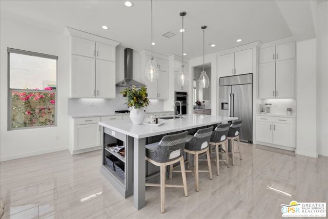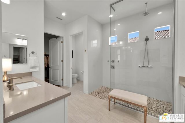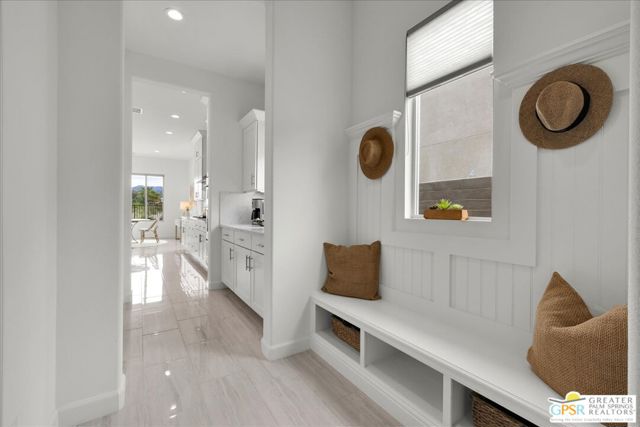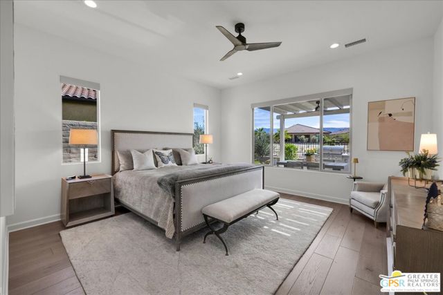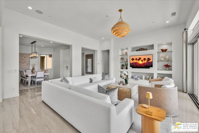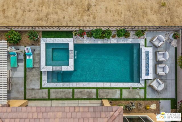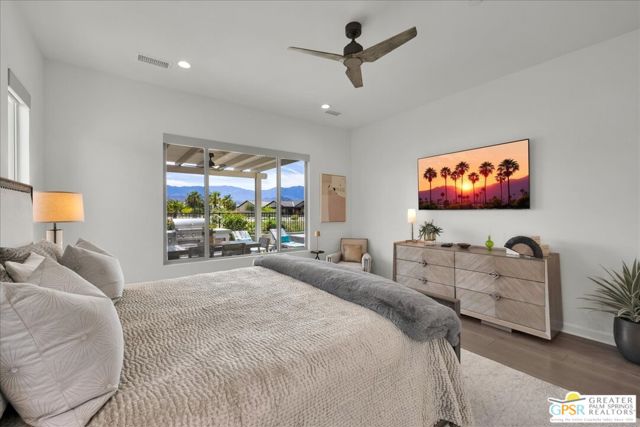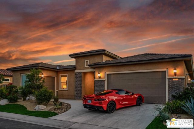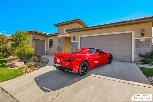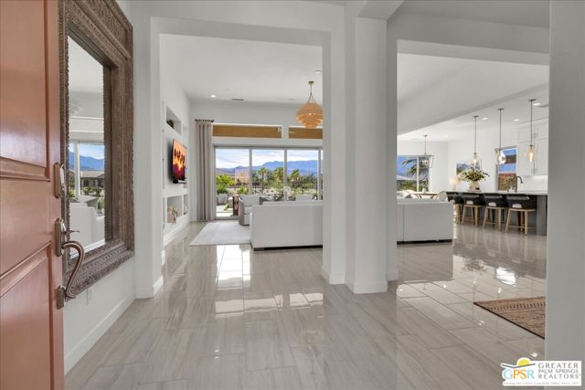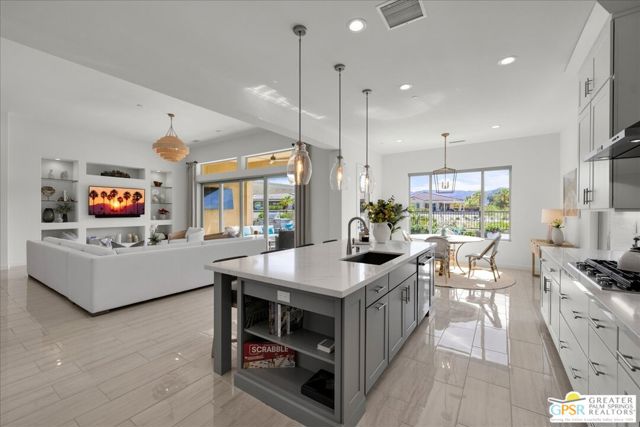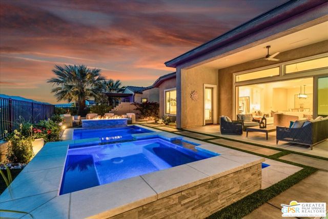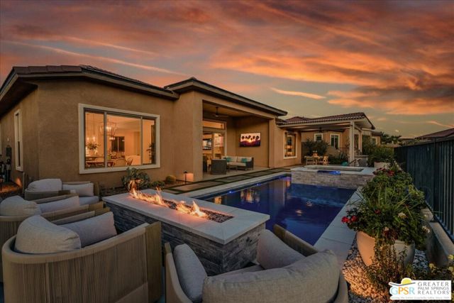 Stunning Journey Floorplan with Panoramic Mountain Views - Del Webb Rancho Mirage. Set on a premium view lot with breathtaking, unobstructed mountain views, this exceptional Phase 5, Plan 9 Journey with Tuscan facade offers a rare opportunity to experience elevated desert living within one of Del Webb Rancho Mirage's more intimate and thoughtfully designed enclaves - a community setting that feels distinctly more refined and manageable than larger-scale developments often found in other markets. Thoughtfully designed and beautifully appointed, this home features the desirable three-bedroom configuration with pass-through bath, ideal for hosting family and guests with both comfort and privacy. Inside, you'll find a sophisticated interior highlighted by porcelain tile flooring, remote-controlled window treatments, and a crisp neutral palette that enhances the home's light-filled ambiance. The heart of the home is the stunning chef's kitchen, showcasing white shaker cabinetry with 42-inch uppers, Jewel cabinets, and crown molding, paired with a premium KitchenAid Professional Series appliance suite. A standout feature is the upgraded DACOR side-by-side refrigerator/freezer with built-in ice and water dispenser, offering energy-efficient performance and SmartThings app connectivity for modern convenience. The expansive executive island, finished in a contrasting tone, offers additional storage, pendant lighting, and generous seating. The kitchen flows effortlessly into the breakfast area, living room, and formal dining space - all designed to capture the home's incredible setting. The breakfast room frames stunning mountain views, while the living room features 12-foot ceilings, a quad-panel sliding glass door system, built-in display niches with accent lighting, and integrated rear-channel speakers. The formal dining room is equally refined, complete with designer lighting, a statement accent wall, and a wet bar with quartz countertops and wine refrigeration. The primary suite is a serene retreat, offering warm wood-look porcelain flooring and sweeping views of the mountains and backyard oasis. The ensuite bath features dual vanities, upgraded fixtures, a glass-enclosed rain shower with custom stone flooring, linen storage, and a spacious walk-in closet. Step outside to a truly exceptional outdoor environment, where panoramic mountain views provide a breathtaking backdrop. The backyard was professionally designed and completed in 2024 by an award-winning contractor recognized by the City of Rancho Mirage, and features a stunning pool and spa finished in Natural Carrara porcelain tile (Grigio Gray), a custom fire pit, and a built-in BBQ beneath a pergola. The covered patio is further enhanced with an outdoor-rated Samsung TV, creating the perfect setting for relaxing evenings or entertaining under the desert sky. The guest wing is thoughtfully designed with two bedrooms, each with wood-look porcelain flooring connected by a pass-through bath, along with access to a convenient powder room, offering both comfort and flexibility for guests. Additional highlights include leased solar ($176/month), a two-car garage with epoxy floors, a separate golf cart garage, and numerous quality upgrades throughout. Located within the prestigious 55+ Del Webb Rancho Mirage community, residents enjoy access to a resort-style clubhouse, fitness center, pools and spa, tennis and pickleball courts, and a vibrant social calendar - with cable and internet included in the HOA. A refined, thoughtfully upgraded home offering luxury, privacy, and a truly exceptional desert lifestyle.