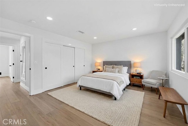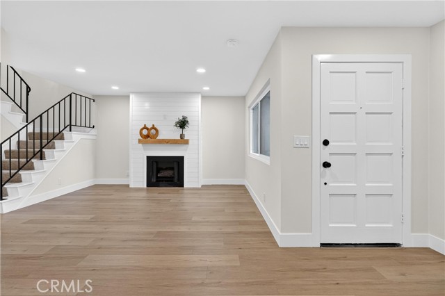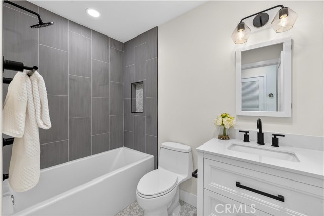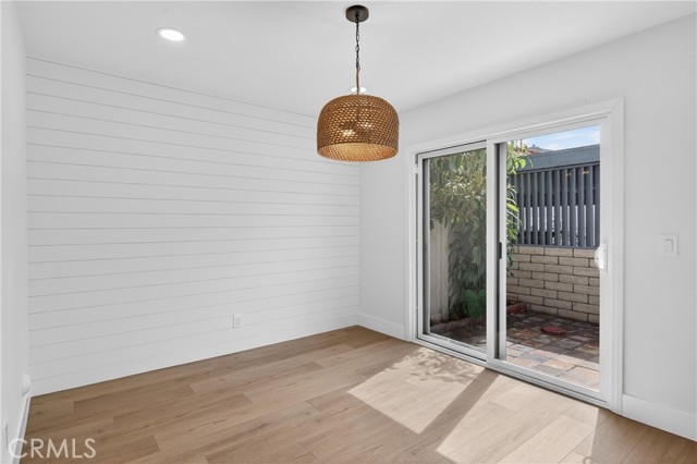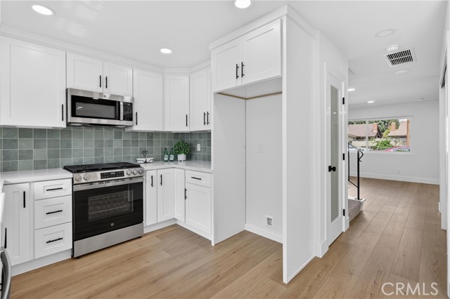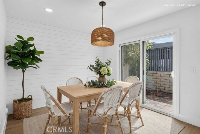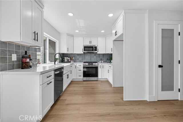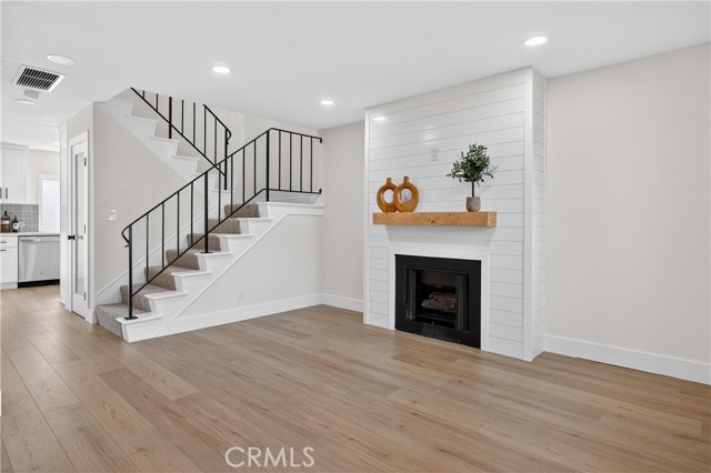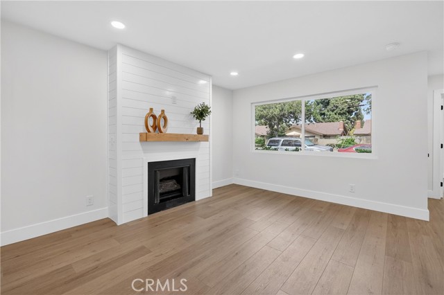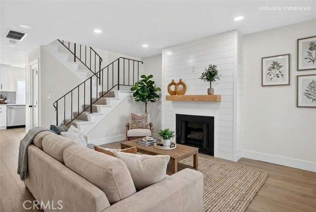 Beautifully upgraded 4 bedroom 3 bathroom condo with garage and carport located in the desirable community of 1910 W. Palmyra Ave #112 in Orange. This thoughtfully renovated home showcases quality upgrades and stylish design throughout. Brand new windows allow abundant natural light to fill the space, complemented by recessed downlighting installed in every room and corridor. The interior features natural medium oak laminate flooring throughout, creating a warm and cohesive look. The inviting living room highlights a stunning sage green board-and-batten feature wall and a white shiplap fireplace, providing a cozy yet modern focal point. The fully remodeled kitchen offers white cabinetry paired with marbled quartz countertops and hand-painted sage green tile backsplash accented with matte black hardware. Functional design elements include under-cabinet lighting, two Lazy Susan corner cabinets, a pull-out trash drawer, and a reach-in pantry for ample storage. Appliances include a General Electric gas range, over-the-range microwave, and a GE 3-rack stainless steel dishwasher. The dining area is enhanced with a white shiplap accent wall and a natural woven chandelier, creating a warm and stylish space for dining. Major system upgrades include a new HVAC system, new water heater, and new garage door opener. All 3 bathrooms have been beautifully updated with designer finishes. One bathroom features nature-inspired green shower tiles with penny floor tiles and brass Pfister fixtures. Another offers neutral grey shower walls, marbled hexagon flooring, a deep soaking tub, and matte black fixtures. The luxurious primary en-suite bathroom includes a 60” double-sink black vanity with brass hardware, large brass mirror, and a stunning tiled shower with porcelain marble-look walls and faux wood tile flooring. Each shower includes a built-in niche for added functionality and design. Layered lighting throughout the home creates a bright and inviting atmosphere at any time of day. This move-in ready property combines modern upgrades, thoughtful design, and comfortable living in a prime Orange location. This gated complex also offers a beautiful large pool and spa and large clubhouse. This home offers unbeatable convenience just minutes from Chapman University, Old Towne Orange, The Outlets at Orange, Main place Mall, St. Joseph and CHOC Hospitals, and major freeways (I-5, 22, 57, and 91) —placing shopping, dining, education, and entertainment.