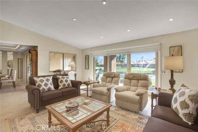 Experience elevated desert living in this beautifully updated condo within the sought-after gated community of Chaparral Country Club, centrally located in Palm Desert. This light-filled home features a stylish kitchen with quartz countertops, designed for both everyday living and entertaining, along with a dramatic vaulted living room with recessed lighting and a statement gas fireplace. Step outside to a covered patio that captures breathtaking views of the golf course, including a beautiful view of the first hole, with mountains rising in the distance. The patio is ideal for outdoor dining and relaxation, complete with sun shades for added comfort. An outdoor atrium provides additional open-air space, perfect for enjoying the desert climate or creating a private garden retreat. The primary suite offers a comfortable retreat with a walk-in closet and an en-suite bath, while the guest bedroom enjoys views of the atrium and generous storage. Additional features include tile flooring throughout the main living areas, ceiling fans, an indoor laundry area, and a two-car garage. Located just a short stroll to one of the community’s pools and spas, residents also enjoy access to multiple pools throughout the neighborhood, along with pickleball and tennis courts, a fitness center, clubhouse, restaurant, and an active social calendar. The beautifully maintained grounds surround an 18-hole executive golf course, creating a true resort-style setting. HOA amenities include cable, internet, exterior maintenance, roof coverage, landscaping, trash, and security with 24-hour gated access and patrol. Conveniently close to El Paseo’s premier shopping and dining, as well as top-tier entertainment and golf, this home offers the perfect blend of comfort, lifestyle, and location.